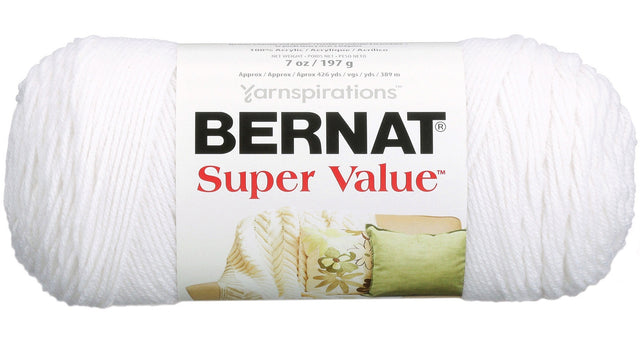 BERNAT-Super Value Solid Yarn. Knitting worsted weight is the most popular weight for knitting and Bernat has an extensive shade range in the super value yarns which happen to be easy to care for and long wearing as well. Weight category: 4, 100% Acrylic, 7oz/197g, 426yd/389m. Gauge: 18st x 24r = 4in/10cm on size 8/5mm knitting needles and H8/5mm crochet hook. Care: machine wash, tumble dry, do not bleach, do not iron, do not dry clean. Imported.