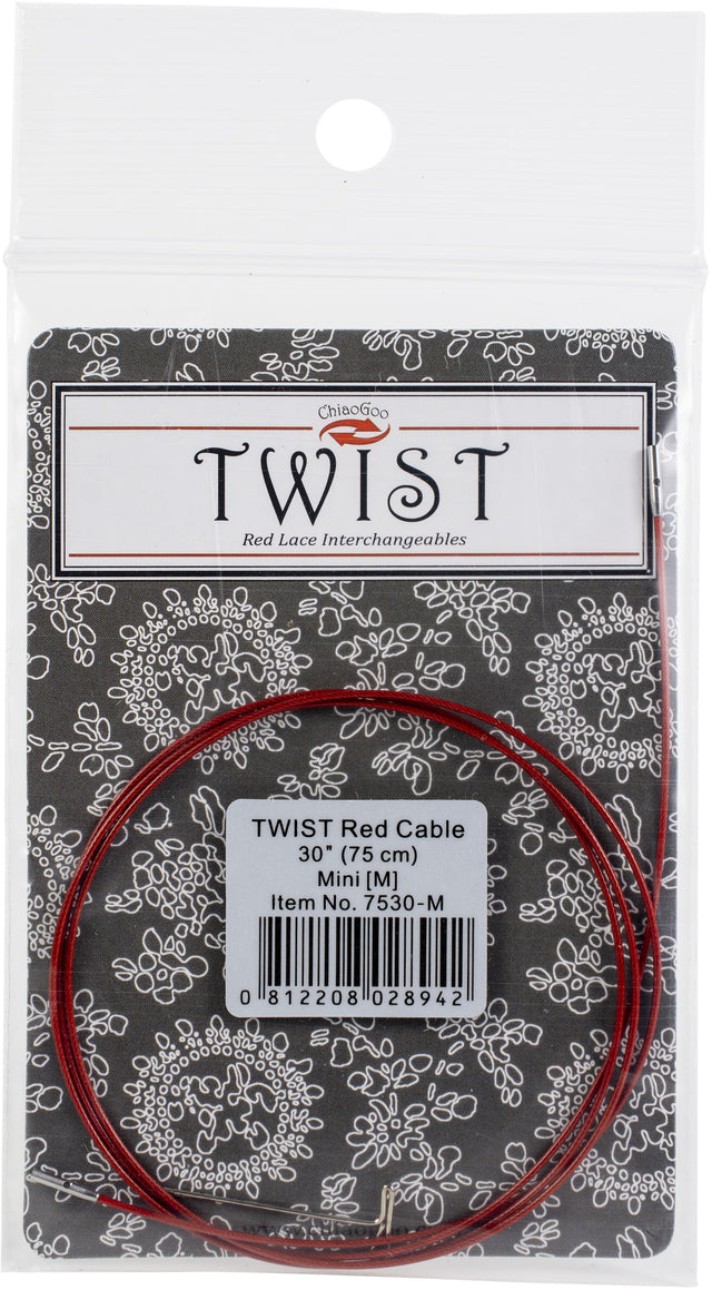 ChiaoGoo-TWIST Red Lace Interchangeable Cables: Mini. TWIST cables are memory-free! They consist of a multi-strand, steel cable coated with red nylon. They can be used with the 4 inch (10cm) tips to 16 inch (40cm) circular or connected to other cables. This package contains one 30 inch mini interchangeable cable. Imported.