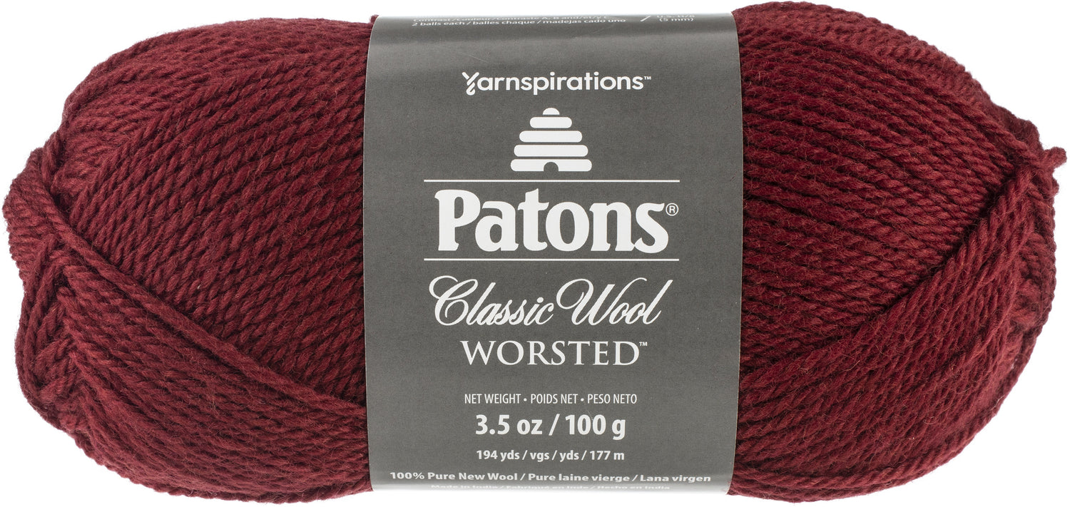 PATONS-Classic Wool. Patons Classic Wool Worsted really is a classic yarn. This 100% wool yarn is worsted weight, making it incredibly versatile for so many different projects! Try Class Wool Worsted out when you start your next sweater or blanket pattern and we think you'll fall in love. Available in a wide shade range that covers everything from neutrals to neons, any knit or crochet project made in this yarn will be an heirloom! Keep your warm, woolly projects looking beautiful by handwashing them and laying them flat to dry, so everyhing you make can last a lifetime. Weight category: 4. Content: 100% wool. Putup: 3.5oz/100g, 194yd/177m. Gauge: 20sx26r = 4in/10cm on size US7/4.5mm knitting needles. Suggested crochet hook: USH8/5mm. Dyelotted: we try but are not always able to match dyelots. Care: hand wash, dry flat. Comes in a variety of colors. Each sold separately. Imported.