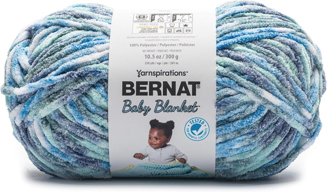 A luxuriously soft, chenille-style yarn that's perfect for baby blankets and garments. This machine washable and dryable yarn is the perfect versatile yarn for Baby. The big gauge makes projects fly by. Bernat Baby yarns are Oeko-tex certified, tested for over 300 harmful substances, and proven safe for your baby's sensitive skin. Make a project in every shade! Weight Category: 6. Content: 100% Polyester. Put up: 10.5oz/300g, 220yd/201m. Gauge: 8stX13r=4in/10cm on size US11/8mm knitting needles. Suggested crochet hook size: L11/8mm. Dyelotted: we try but are not always able to match dyelots. Available in a variety of colors. Each sold separately. Machine Wash Cold, Do Not Bleach, Dry Flat, Do Not Iron, Do Not Dry Clean. Imported.