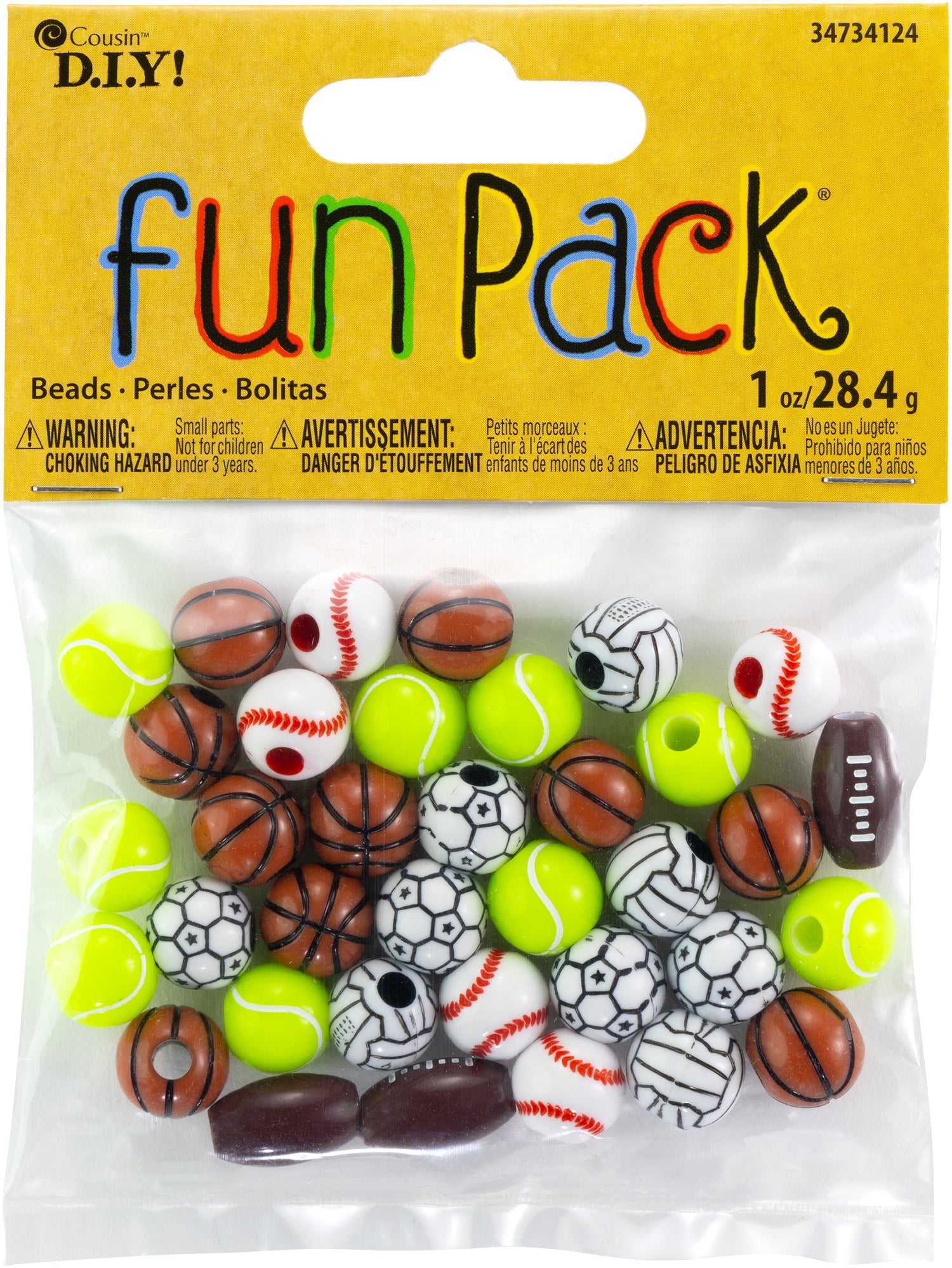 COUSIN-Fun Pack: Acrylic Beads. This package contains 1 ounce of acrylic beads in a variety of sports ball shapes. Sizes range from 1/2 to 5/8 inch. WARNING-CHOKING HAZARD-Small parts. Not for children under 3 years. Imported.