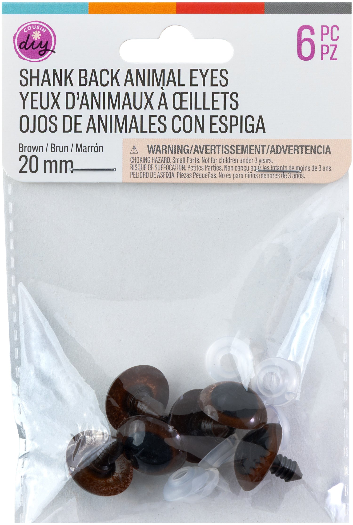 Brown animal eyes with plastic washers. Bring animals to life with these realistic eyes, attachable through fabric. This package contains two 20mm shank back animal eyes. WARNING: Choking Hazard. Not suitable for children under 3 years. Imported.