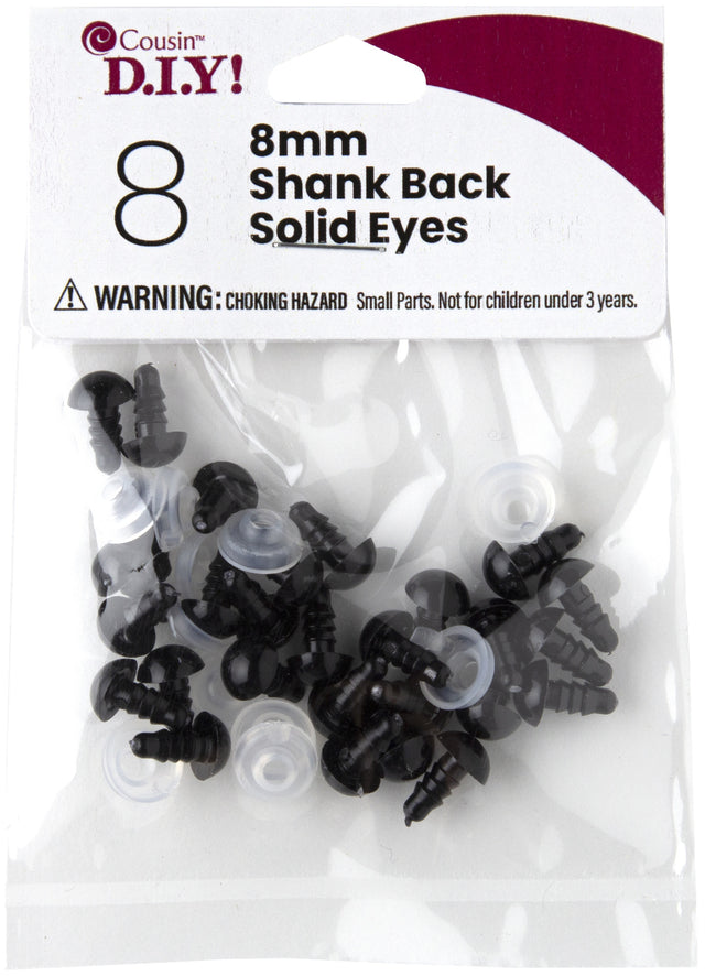 Bring animals to life with these realistic eyes, attachable through fabric. This package contains eight 8mm shank back eyes. WARNING: Choking Hazard. Not suitable for children under 3 years. Imported.