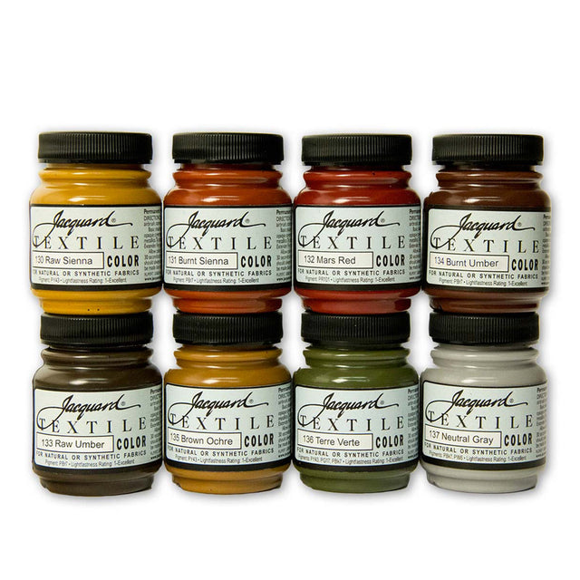 This Textile Set by Jacquard includes 8 - 2.25 fluid ounce jars of various Earth colors. Both semi-transparent and light-bodied, paints can be used on variety of surfaces including natural and synthetic fibers including fabric, leather, paper, wood or canvas. Made with professional-quality Jacquard Textile paints are washable and colorfast, leaving fabric soft after cleaning. Colors included in this set are: raw sienna, burnt sienna, mars red, raw umber, burnt umber, brown ochre, terre verte, neutral gray. Made in the USA. UPC 743772028260