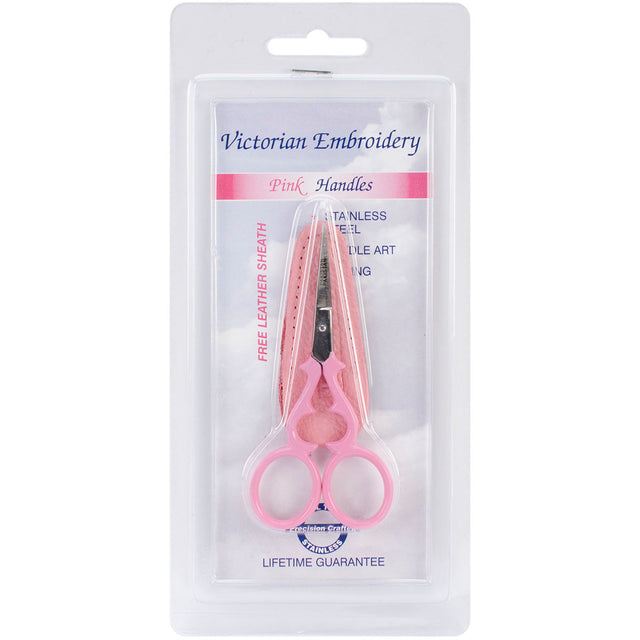 TOOLTRON INDUSTRIES-Victorian Embroidery Scissors. The Tooltron brand is well-recognized and a favorite of quilting enthusiasts around the world. These 3-1/2 inch pink embroidery scissors come with a free leather sheath. They are stainless steel and are great for needle arts and sewing. This brand offers a lifetime guarantee. Imported.